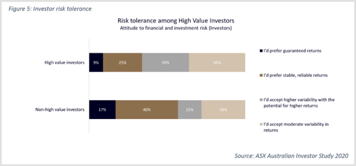 Figure 5 shows that in general most people prefer a relatively stable return. The exception being high net worth individuals, who are prepared to take greater risks to accelerate their wealth accumulation. However, the theme from Figure 5 is inconsistent with the asset allocation decisions of most Australians. A contributing factor to this outcome may be the lack of understanding of the alternative products.